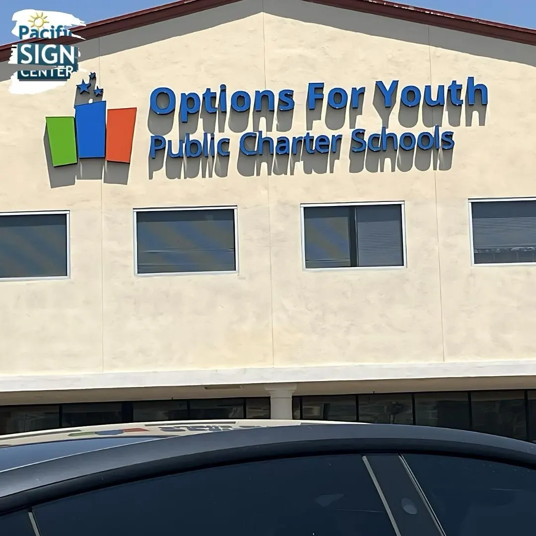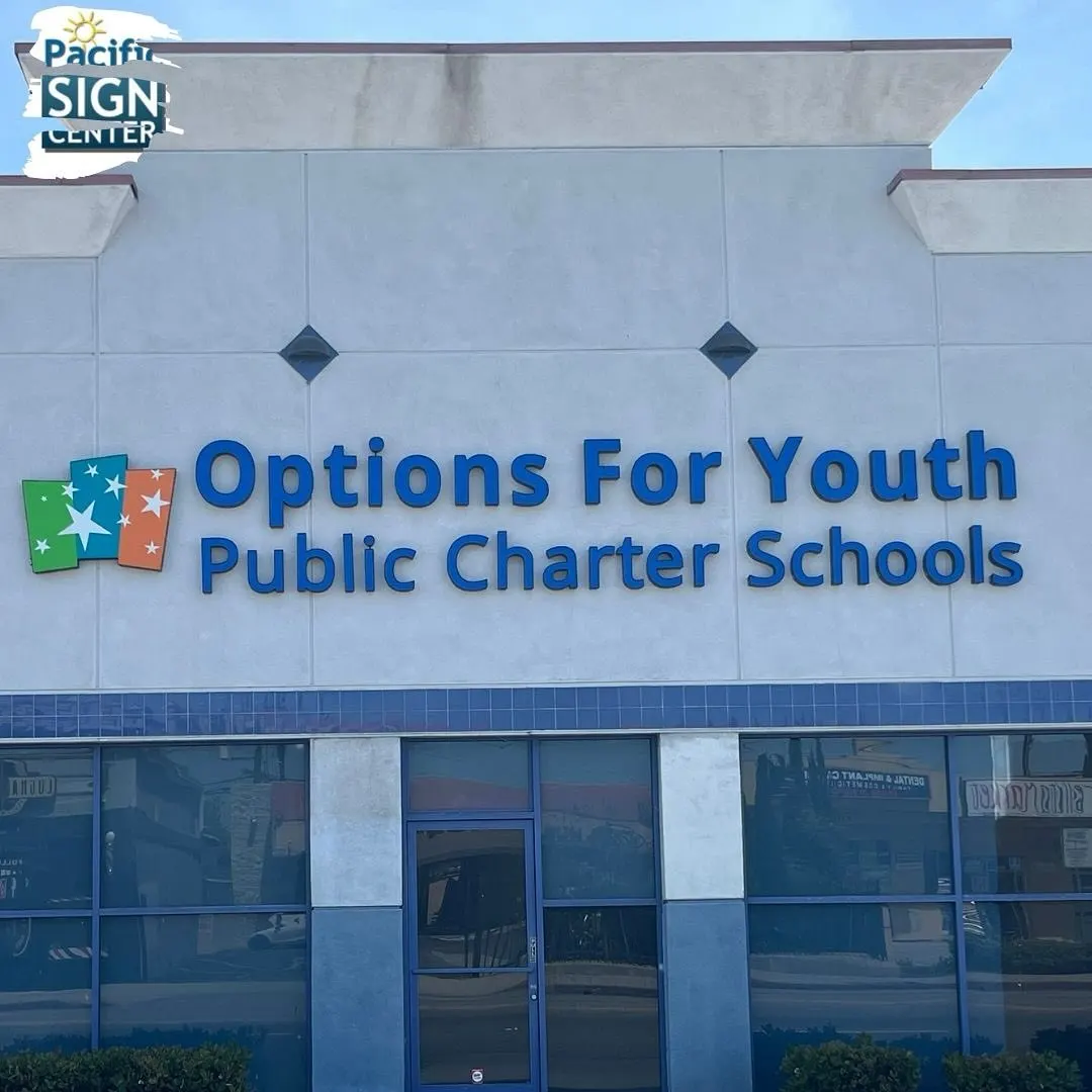 We designed, fabricated and installed two signs for the new Options For Youth School in the city of Bell. The signs are made of 3/16” white translucent acrylic faces with blue vinyl overlay. The logo has multi color vinyl overlay. The letters have 5” black aluminum returns and ¾” trim caps. They are mounted flush on the stucco wall. #pacificsigncenter #signsbypasificsigncenter