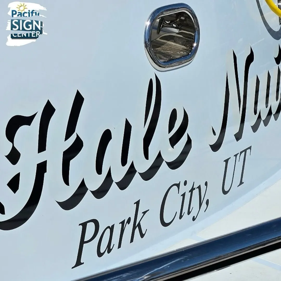 We designed fabricated and installed the new name (Hale Nui) on this Northaven 61 yacht in Dana Point Harbor. The decal is made of digital print cut vinyl in gray with a black drop shadow applied on the transom of the yacht. #danapoitsignshop #boats_by_pacificsigncenter #pacificsigncenter #boatnames #boatgraphics #missionviejo #newportbeach #cotodecaza #laderaranch #lagunahills #lakeforest #eltoro #sanjuancapistrano #ranchosantamargarita #trabucocanyon #irvine #tustin #alisoviejo #danapoint #danapointharbor #lagunabeach #lagunaniguel #orangecounty #sanclemente #coronadelmar