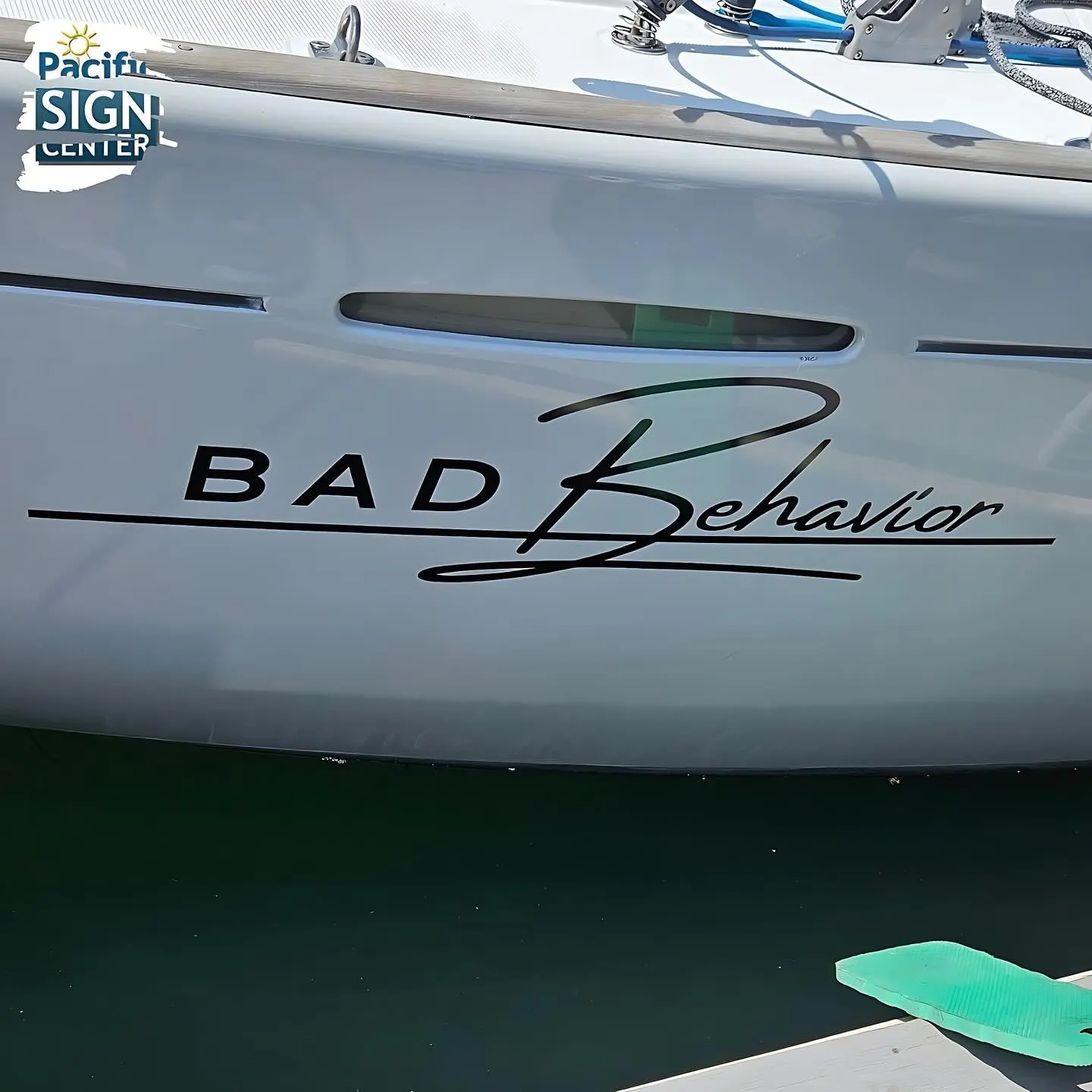 Bad Behavior We designed, fabricated, and installed custom boat lettering for this sailboat in Dana Point Harbor. The name says it all. Cut from premium black vinyl and applied on both sides of the hull, this decal is built to last—just like this boat's adventures. #BoatLettering #DanaPointHarbor #pacificsigncenter #VinylDecals #CustomBoatNames #MarineGraphics #SailboatLife #BadBehavior #BoatLife #HarborStyle #VinylLettering #NauticalDesign
