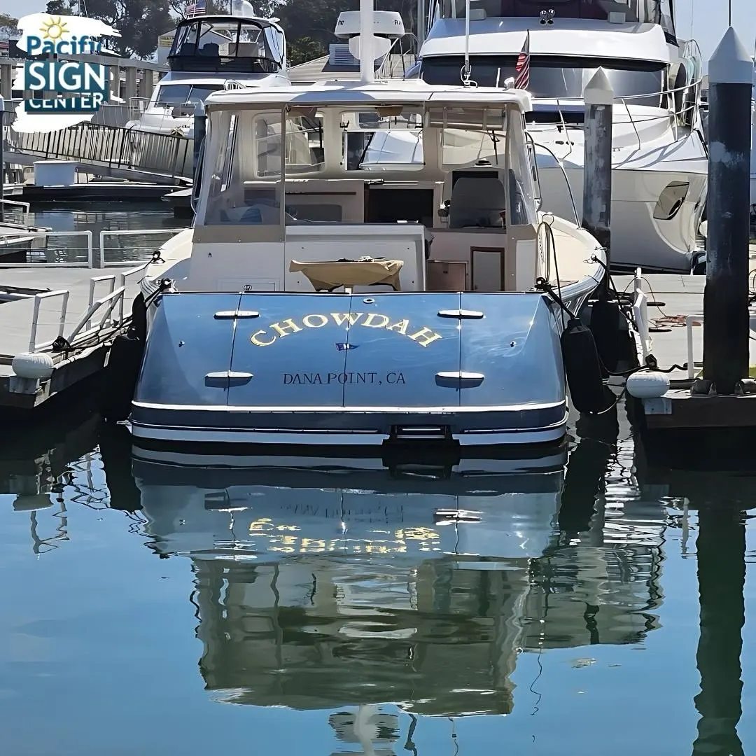 Chowdah. We designed and fabricated the new name for this yacht in Dana Point Harbor. The decal is made of two layers. The first layer is black cut vinyl. The second layer is gold leaf cut vinyl. The burgee is digital print cut vinyl all applied on the sloping transom of the yacht. #pacificsigncenter