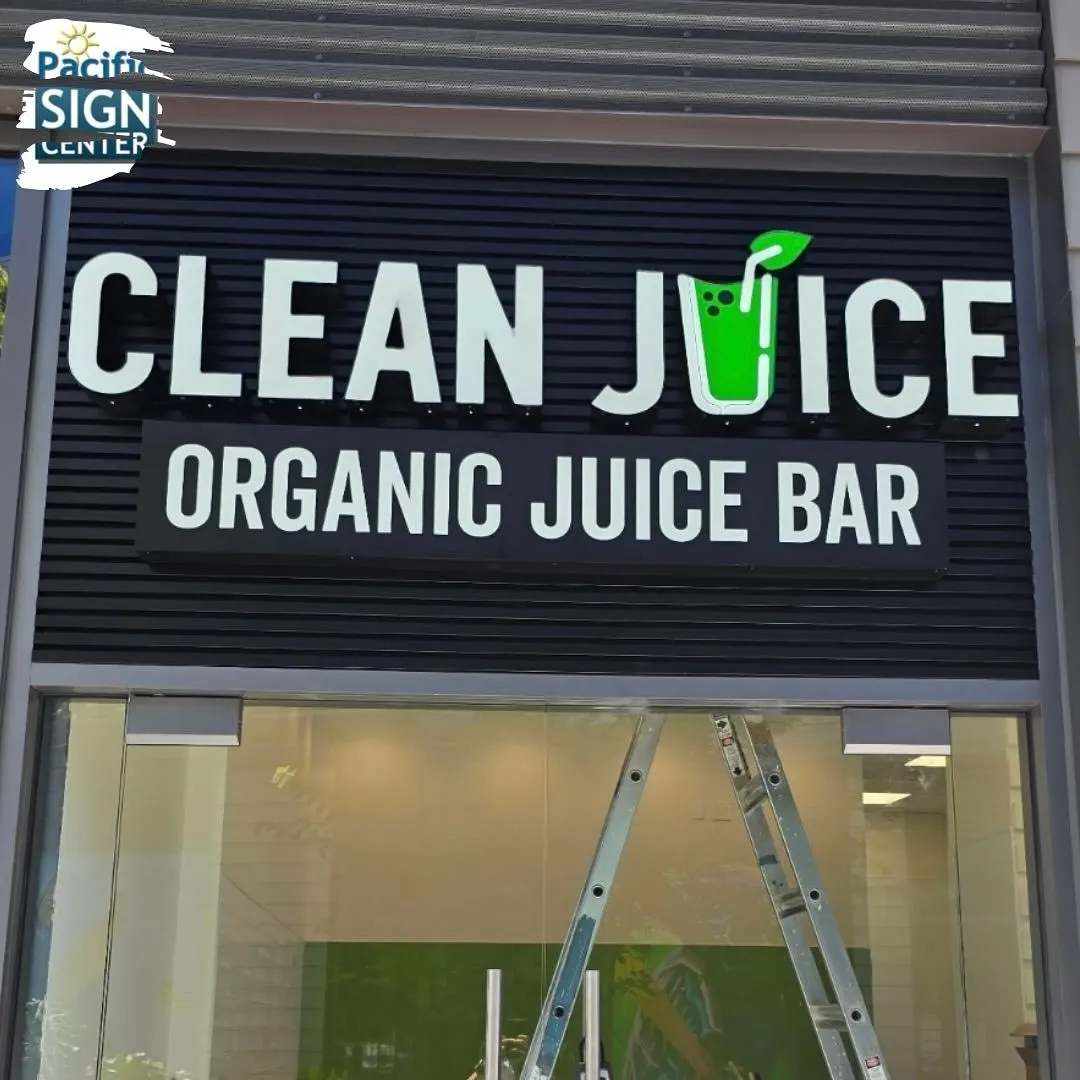 🌿 Clean Juice - West LA New location alert! 📍Pico & Olympic Blvd We had the pleasure of designing, fabricating, and installing the custom signage for Clean Juice’s newest spot in West LA. ✨ Details matter: 🔹 Channel letters with 3/16” white translucent acrylic faces 🔹 5” black aluminum returns + ¾" black trim caps 🔹 Logo applied as digital print overlay 🔹 Under copy: routed box sign with flush-mounted white translucent push-thru acrylic on wood slotted façade. #Signage #ChannelLetters #WestLA #CleanJuice #SignDesign #Fabrication #CustomSigns #ArchitecturalSignage #LAInstall #PushThruAcrylic #BoxSign #Branding #StorefrontDesign #pacificsigncenter #signsbypacificsigncenter