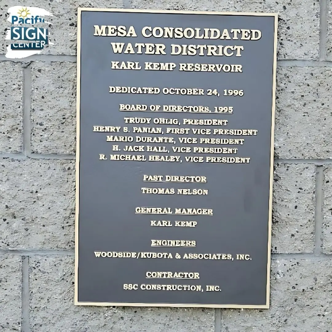 We recently designed and fabricated a custom bronze plaque for the Karl Kemp Reservoir, honoring a lasting legacy at the Mesa Consolidated Water District. Cast bronze with raised gold-painted lettering. Sand pebble texture background in rich brown. Mounted with blind studs for a clean, seamless look #PublicWorks #BronzePlaque #Dedication #CustomFabrication #MesaWater #DesignDetails #PlaqueDesign #LegacyProject #pacificsigncenter