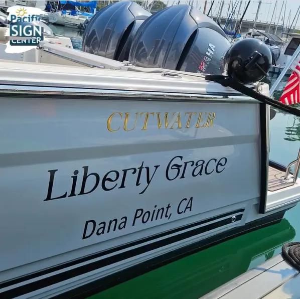 We designed, fabricated, and installed this stunning new boat name for a fishing vessel in Dana Point Harbor! This custom decal features a single-layer digital print cut vinyl with a bold gold engine turn design, perfectly mounted on the transom for that clean, high-end look. Proudly crafted by our team at Pacific Sign Center - where quality and craftsmanship meet the water. #PacificSignCenter #BoatsByPacificSignCenter #DanaPointHarbor #BoatLettering #BoatGraphics #CustomVinyl #BoatDecals #TransomArt #MarineGraphics #BoatLife #SoCalBoating #GoldLeafLook